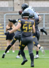 Das schwache Spiel der Minden Wolves aber nur an den Snaps festzumachen, wäre viel zu einfach. Nach Punts oder KickOffs ließ man den Krefeldern einfach viel zu viel Raum, agierte nicht, sondern reagierte, setzte zu selten zum Tackle an und wurde dadurch überlaufen – und fand den Gegner schließlich zumeist nach einem 40-, 50-Yard-Return schon weit in der eigenen Hälfte wieder. Das machte es der Ravens-Offense natürlich leichter, die Endzone zu erreichen.