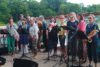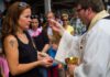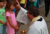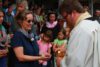 Flotte Musik und Schwung brachte der Projektchor Sommerfest mit ins Spiel. Im Mittelpunkt stand natürlich das Runde Leder und so wurden Gemeinsamkeiten, als auch Unterschiede zwischen Kirche und Fußball durchleuchtet. Selbst der Altar war geschmückt mit Trikot, Fahne, Pokal und einem Fußball mit der Aufschrift „Ich glaub dran“. Kinder trugen Fürbitten vor. Sie beteten für Fair Play, für ein gelingendes, menschliches miteinander der Fans und Spieler, aber auch für das Austragungsland Brasilien, dass die Investitionen zu mehr sozialer Gerechtigkeit und nachhaltiger Entwicklung des Landes beitragen mögen. Die Kollekte wird für das Missionsprojekt „Straßenkinder in Recife“ (Brasilien) gespendet. Einige Vereinsmitglieder fliegen in zwei Wochen ins WM-Land nach Recife und werden die Spenden dort an Pater Benedikt übergeben. Anschließend hatten die Besucher die Qual der Wahl: Was esse ich zu Mittag? Pommes, Pizza, Gulaschsuppe oder vielleicht doch ein Bratwurst? Ebenfalls lockten Obstsalat, Waffeln, Kuchen, Crêpes, Eis oder Zuckerwatte.